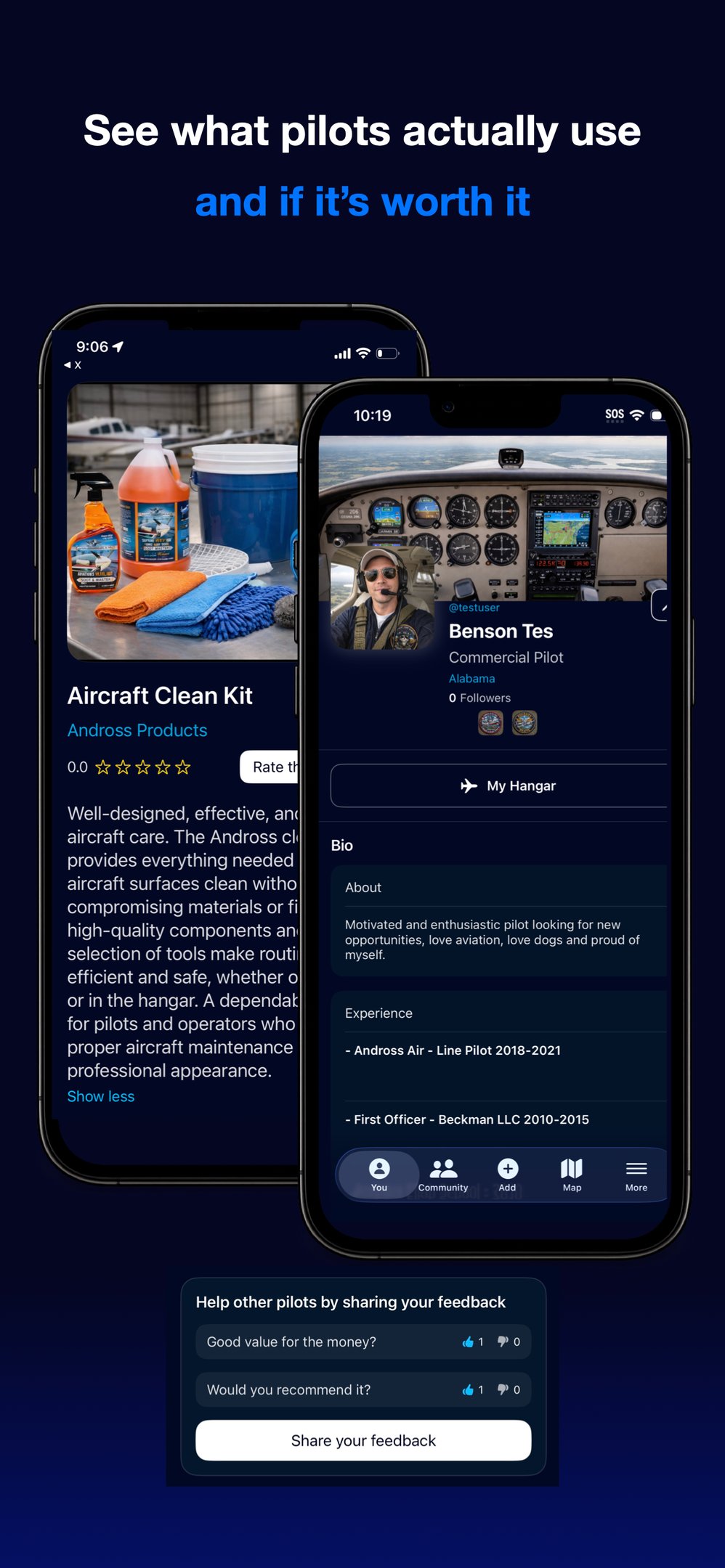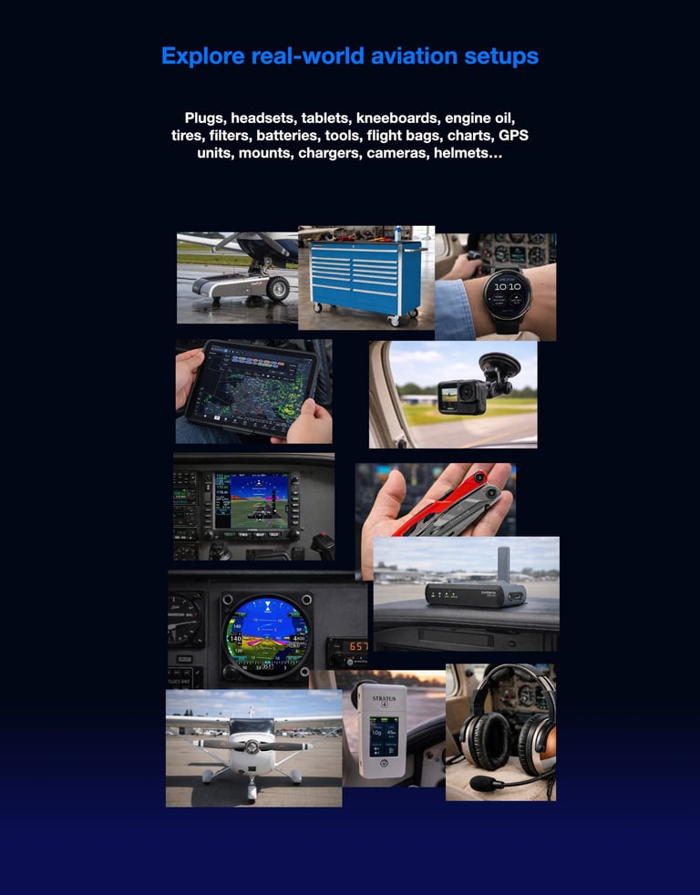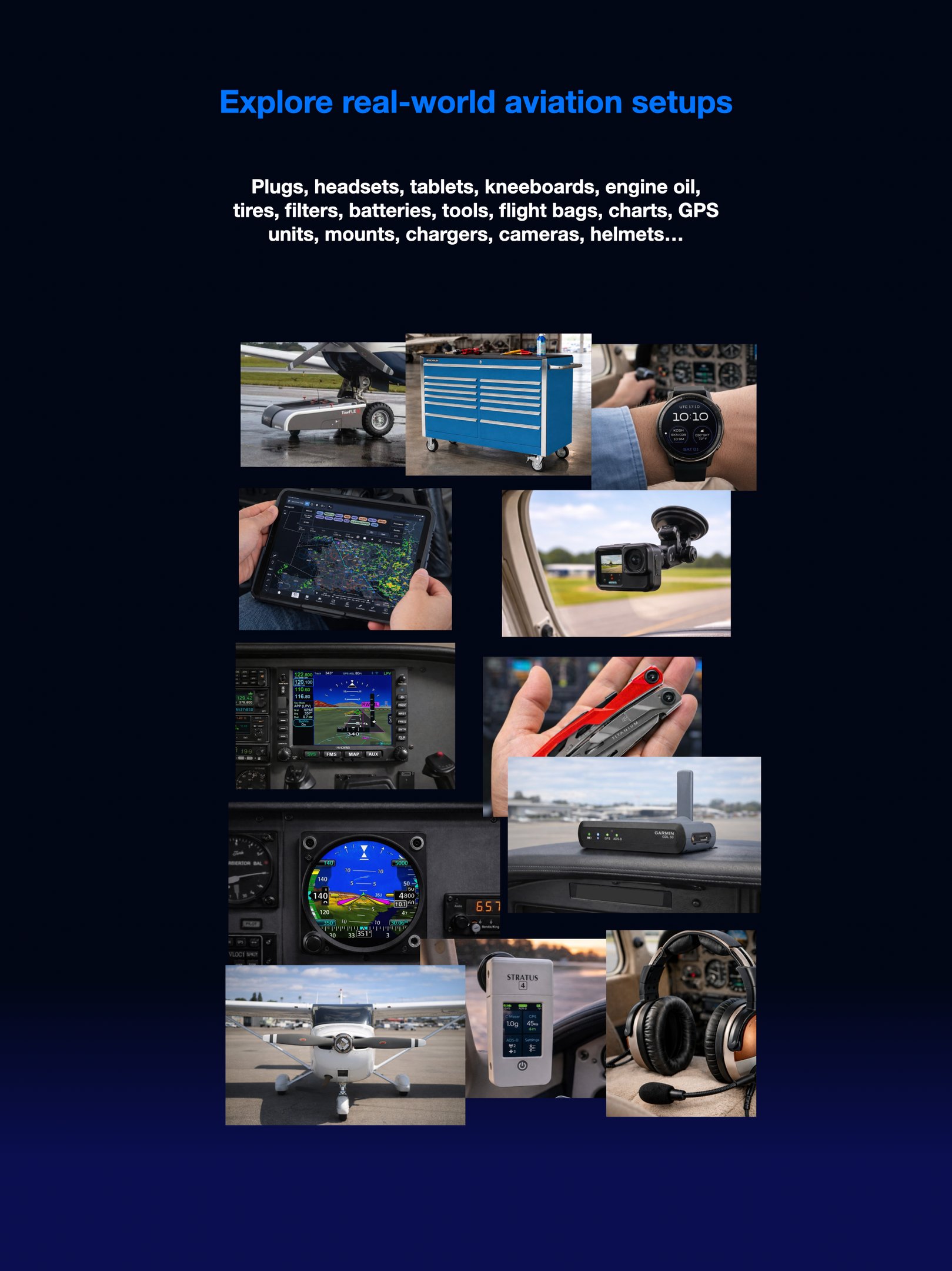 Aviation-focused only, your setup tells a story. Show how you equip your aircraft, explain why it works for you, and explore how other pilots use and rate similar gear. A shared space for real-world experience, with no ads, no algorithms, no spam, no bots, built around clarity and trust.