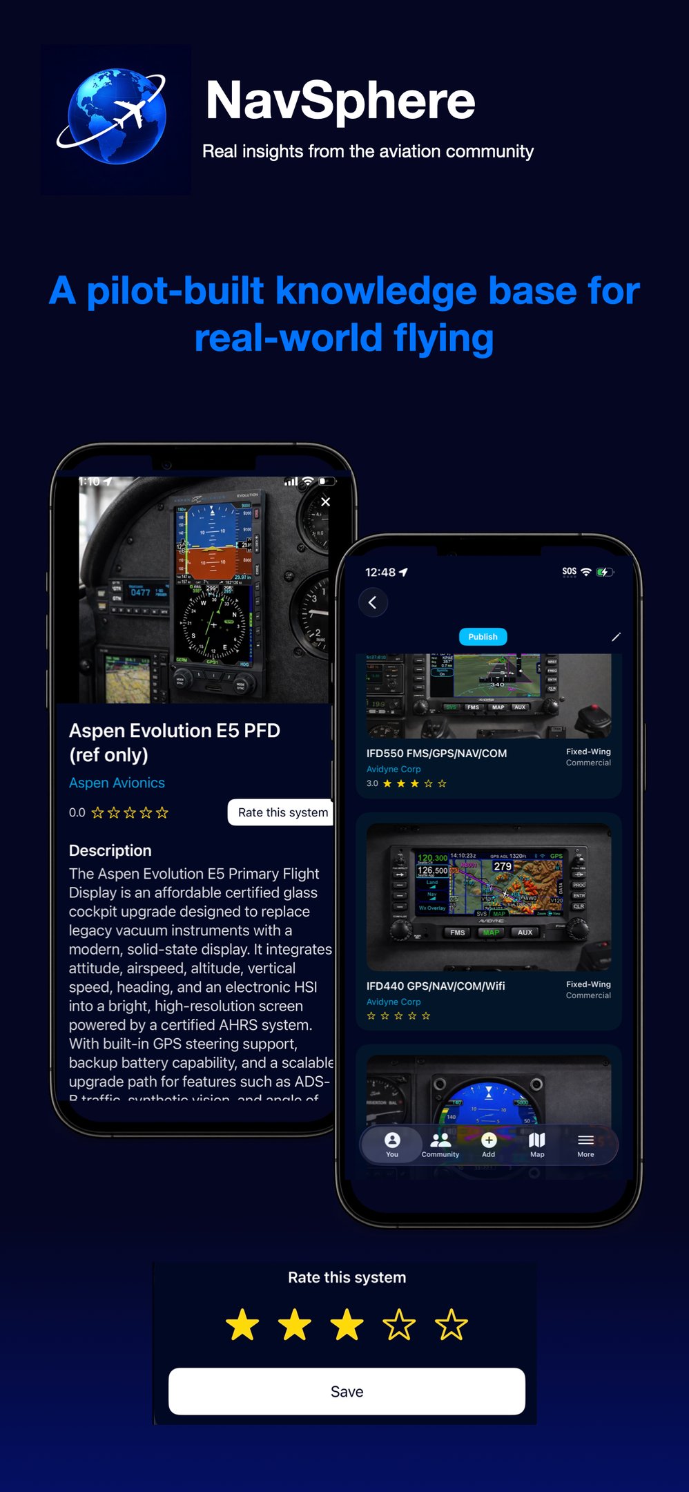 Pilots can join NavSphere and create a free lifetime profile to document their aircraft, avionics, and flight gear, and share how it performs in real-world flying. NavSphere captures this firsthand experience and transforms it into shared insight, allowing others to understand what is commonly adopted, repeatedly trusted, and proven through everyday operations, using ratings, feedback, and comments for validation